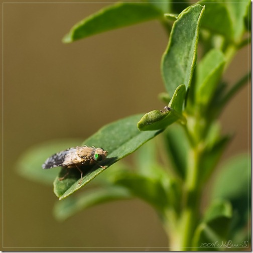 Заприметила издалека мушку. Крооооохотную, просто микроскопическую. Наверное, чуть больше дрозофилы. При чем и не увидела бы, не будь у мушки совершенно необыкновенных ярко-изумрудных глазок. Увидела их издалека.