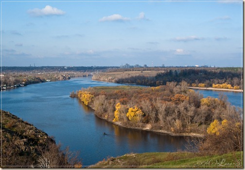 Такой Днепр узенький... Я раньше в Днепропетровске жила. У нас полтора километра в ширину, Левый берег почти не виден, только полоска с силуэтами жилмассивов. Но все равно жутко родной. Я так по нему соскучилась, по рыжей водичке, пляжам, запахам...